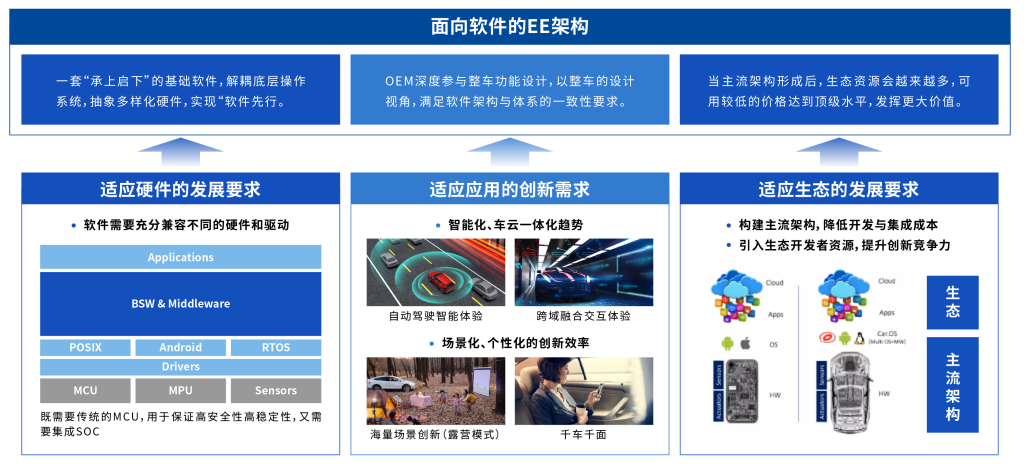 SDV新階段下,汽車軟件極高的復(fù)雜度、龐大的規(guī)模將前所未有,全新開發(fā)方法學(xué)是促使智能汽車產(chǎn)業(yè)從基礎(chǔ)走向高級(jí)的最本質(zhì)變化,將支持OEM在“創(chuàng)新速度”與“成本”兩個(gè)核心競(jìng)爭(zhēng)力上取得領(lǐng)先,多域融合就是解決這個(gè)問(wèn)題的必然要求。就創(chuàng)新速度而言,多域融合實(shí)現(xiàn)了多個(gè)控制器開發(fā)視圖與開發(fā)方法的統(tǒng)一,將嵌入式的MCU部分挪到中間件以實(shí)現(xiàn)整車多功能組合開發(fā),超越車型、E/E架構(gòu)、線束拓?fù)?、信?hào)定義等去開發(fā)子功能的服務(wù),通過(guò)軟件集約化,更方便地通過(guò)功能組合實(shí)現(xiàn)應(yīng)用的創(chuàng)新。
