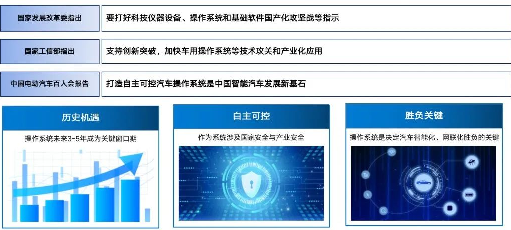 中國電動汽車百人會報告《打造自主可控汽車操作系統(tǒng)》指出,汽車操作系統(tǒng)是我國快速發(fā)展智能汽車的勝負(fù)關(guān)鍵,是中國智能汽車發(fā)展新基石。