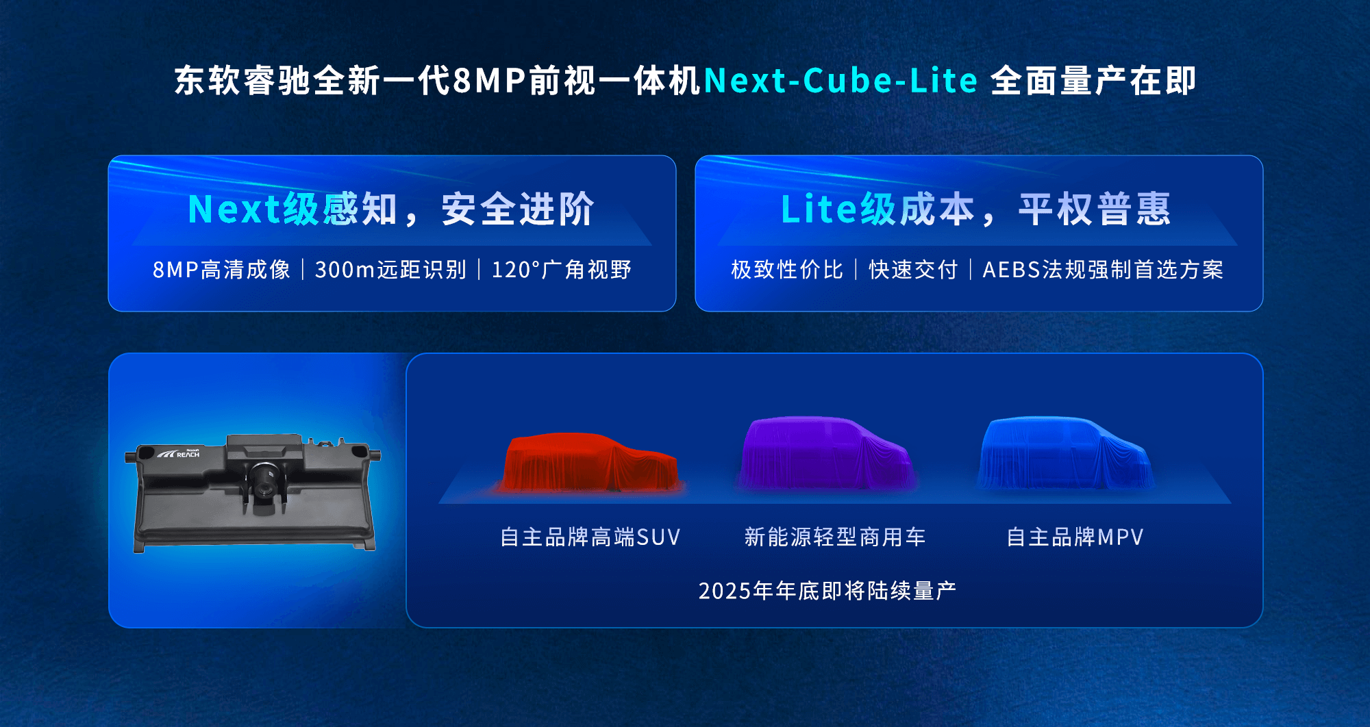 論壇期間,東軟睿馳正式發(fā)布全新一代8MP前視一體機(jī)——Next-Cube-Lite,兼顧安全可靠、極致性能,同時(shí)覆蓋乘用車與商用車多場景應(yīng)用,為車企提供一套極致性價(jià)比、快速交付的高性能輔助駕駛產(chǎn)品。近期,此款產(chǎn)品接連斬獲頭部車企量產(chǎn)定點(diǎn),正成為車企應(yīng)對新規(guī)、強(qiáng)化主動(dòng)安全能力、提升整車智能化競爭力的首選,為用戶帶來更加智能、安全的出行體驗(yàn)。