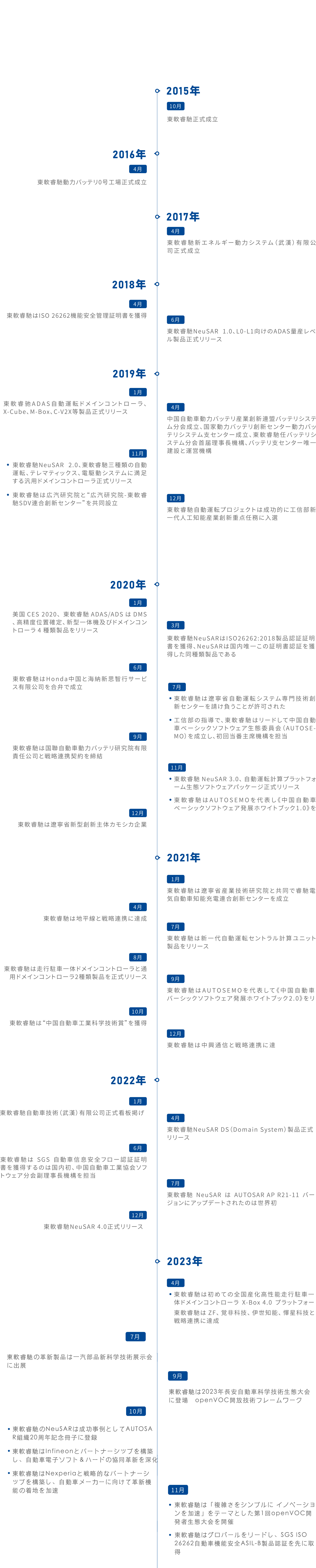 東軟睿馳は2015年10月に創(chuàng)立され、業(yè)界をリードする基礎(chǔ)ソフトウェア、SOAミドルウェア、自動(dòng)運(yùn)転とドメイン跨ぐ融合車(chē)クラウド一體技術(shù)製品とサービスサプライヤーである。會(huì)社はソフトウェア技術(shù)を核心とし、ビッグデータ、人工知能、ベーシックソフトウェアなどの重要技術(shù)を融合し、自動(dòng)運(yùn)転、知能コネクテッド、ベーシックソフトウェア、OSなどの重要分野にフォーカスし、OEMの未來(lái)に向けた技術(shù)革新の発展のために、卓越した、反復(fù)的にアップグレードできる核心技術(shù)、ソフトウェアとハードウェアの一體化製品及びソフトウェアプラットフォーム製品を提供し、OEMの「SDV」時(shí)代の信頼できるパートナーになることに力を入れている。