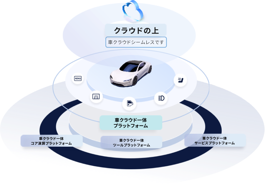 SOAアーキテクチャに基づき、橫方向で完成車の各ECU間のシナジーをプルし、縦方向で車クラウド間のデータ交換と演算力サービスを?qū)g現(xiàn)して、OEM機能開発周期が“年”から“日”へ、機能イテレーション周期が“月”から“時間”へエンパワーメントする。