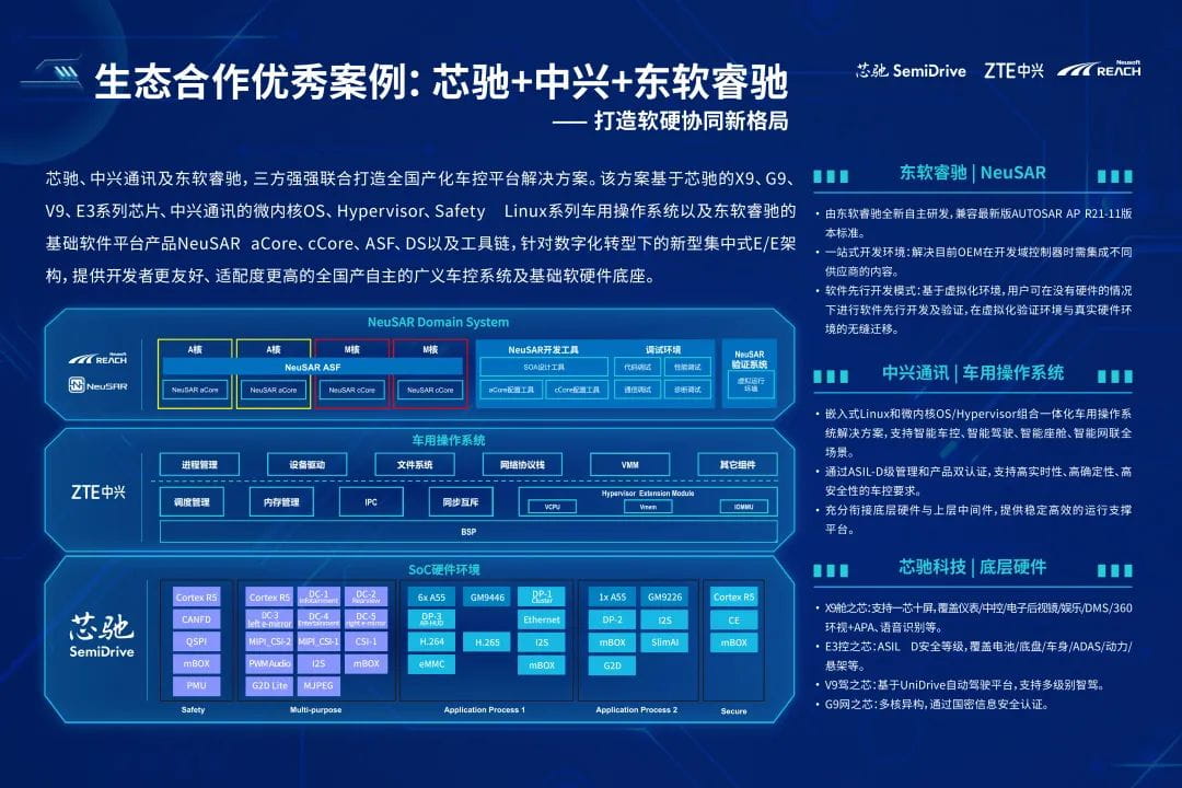 東軟睿馳、中興通訊、芯馳科技三方強(qiáng)強(qiáng)聯(lián)合打造全國(guó)產(chǎn)化車控平臺(tái)解決方案。該方案基于芯馳的X9、G9、V9、E3系列芯片,中興通訊的微內(nèi)核OS、Hypervisor、Safety Linux系列車用操作系統(tǒng)以及東軟睿馳的基礎(chǔ)軟件平臺(tái)產(chǎn)品NeuSAR aCore、cCore、ASF、DS以及工具鏈,針對(duì)數(shù)字化轉(zhuǎn)型下的新型集中式E/E架構(gòu),提供開發(fā)者更友好、適配度更高的全國(guó)產(chǎn)自主的廣義車控系統(tǒng)及基礎(chǔ)軟硬件底座。