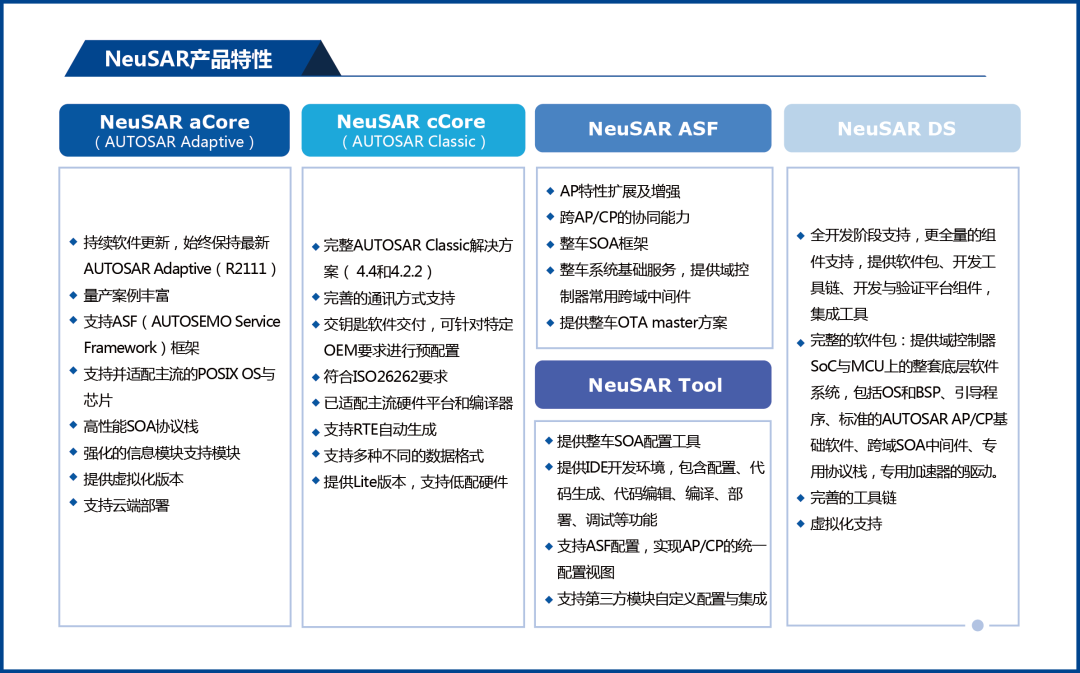 東軟睿馳也在實踐中不斷探索,把一部分通用化的部分固化下來,整合成針對域控制器的軟件開發(fā)平臺——NeuSAR DS(Domain System),它包含了OS,AUTOSAR AP、CP,ASF中間件以及大量的系統(tǒng)級軟件包和工具鏈。