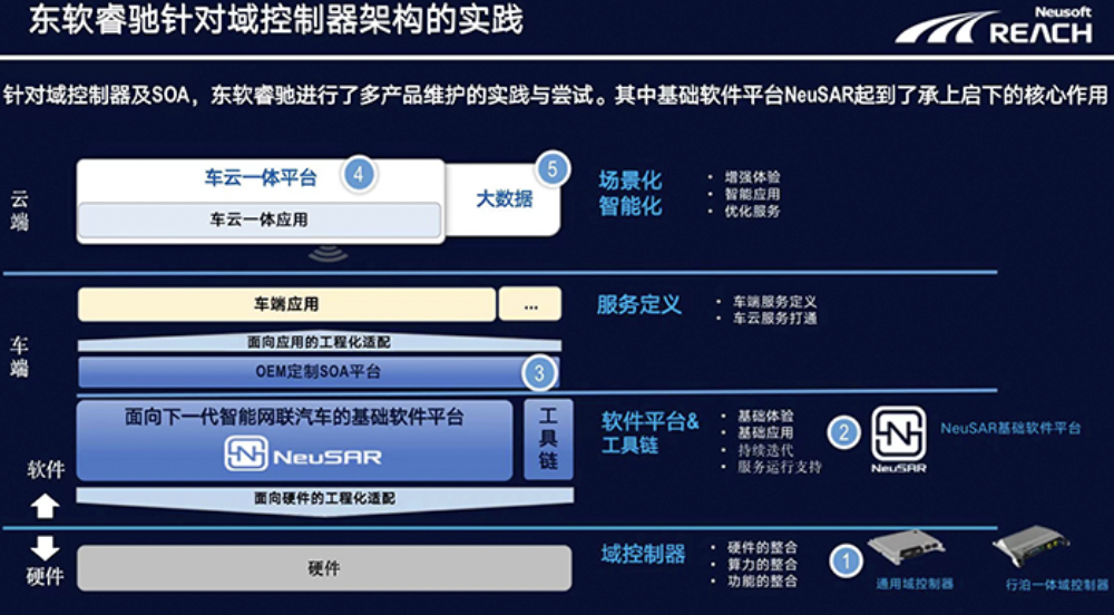 作為“軟件先行”開發(fā)方法論的探索和踐行者,東軟睿馳倡導(dǎo)以標(biāo)準(zhǔn)化的域控制器硬件,通用的基礎(chǔ)軟件平臺(tái)NeuSAR、中間件、工具鏈,以及車云一體平臺(tái)、大數(shù)據(jù)為關(guān)鍵技術(shù)產(chǎn)品,同時(shí)面向OEM提供應(yīng)用軟件開發(fā)的定制化服務(wù),和硬件的適配化服務(wù)。