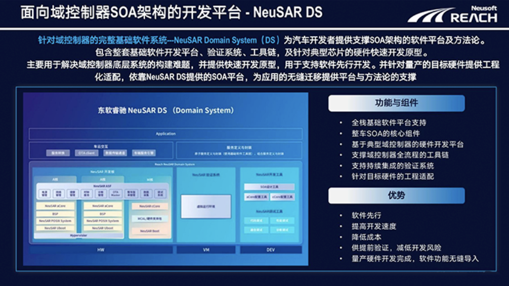 東軟睿馳發(fā)布的NeuSAR DS (Domain System)致力為汽車開發(fā)者提供支撐SOA架構(gòu)的軟件平臺(tái)及方法論,使開發(fā)者可以更高效地開發(fā)出有創(chuàng)造力的新功能。