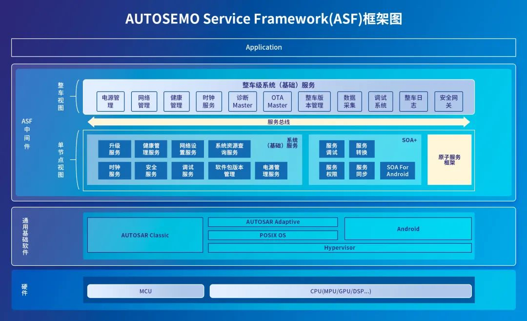 相比AUTOSAR,ASF向應(yīng)用層提供更多基于服務(wù)開發(fā)需要的功能,接口更加豐富和靈活。具體來看,AUTOSAR標(biāo)準(zhǔn)基礎(chǔ)軟件平臺(tái)提供了對(duì)上層提供統(tǒng)一封裝的硬件能力和標(biāo)準(zhǔn)服務(wù)組件,包括各類協(xié)議棧、調(diào)度、存儲(chǔ)、安全等基礎(chǔ)服務(wù)組件及接口,ASF則在此基礎(chǔ)上提供更多整車業(yè)務(wù)層面需要的功能,并封裝成基礎(chǔ)系統(tǒng)服務(wù)與整車系統(tǒng)服務(wù),例如整車級(jí)日志服務(wù)、整車級(jí)診斷服務(wù)等,將各個(gè)節(jié)點(diǎn)的服務(wù)匯總成整車級(jí),為開發(fā)者提供基于整車統(tǒng)一視圖的服務(wù)功能及接口。